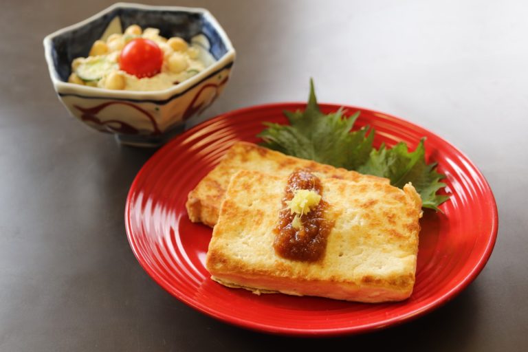 - こめ油を敷いたフライパンで9の豆腐を焼き、両面こんがり焼き色がつけば完成。