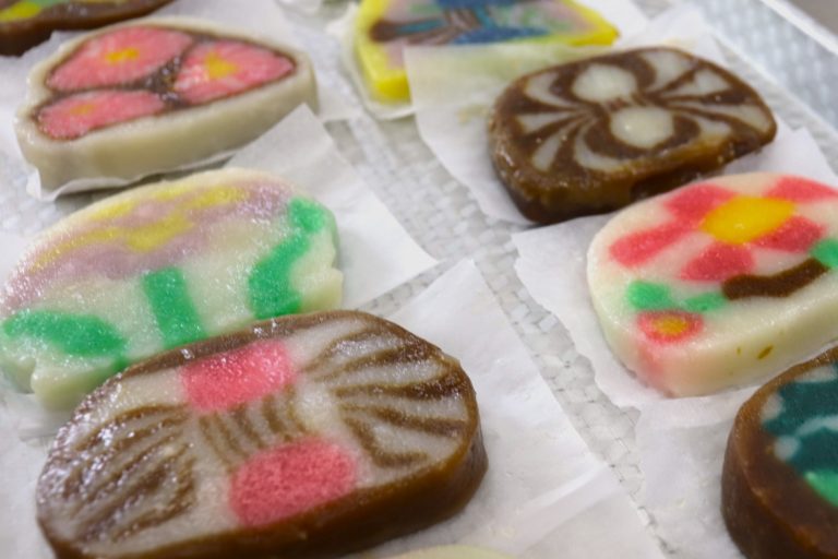 - 様々な色の付いたもちを重ねて形を作り、型を整える。