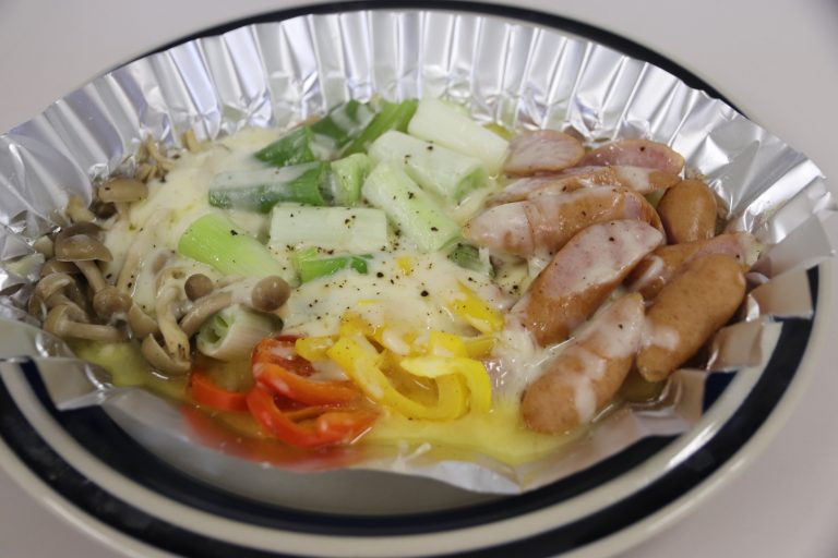 - 1の具材をアルミホイルの上に盛り付け、ガーリックバターソースと塩コショウで下味をつける。