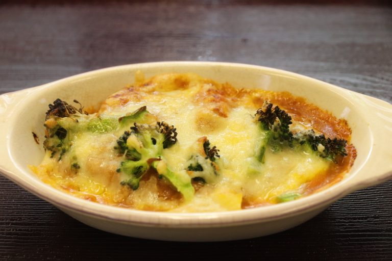 - じゃがいもをひき、ミートソースをのせる。その上に、ブロッコリーとチーズをお好みの量のせる。