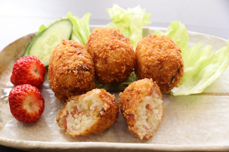 - 4を小麦粉・溶き卵・パン粉の順につけて、油を入れた鍋で強火で揚げる。衣が狐色になるまで揚げたら完成。