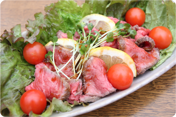 4. 牛肉が冷めたら食べやすい大きさに切り、ドレッシングをかけて完成。