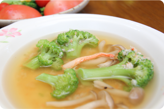 - ブロッコリーを皿に載せ、2のスープをかけて完成。