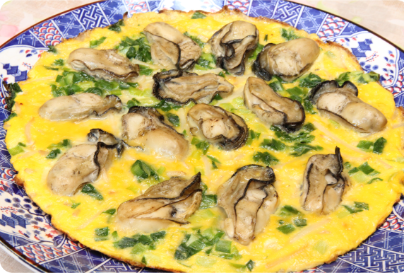 - 箸でざっくりとかき混ぜてカキとニラを載せ、玉子が半熟になるように弱火で火を通す。