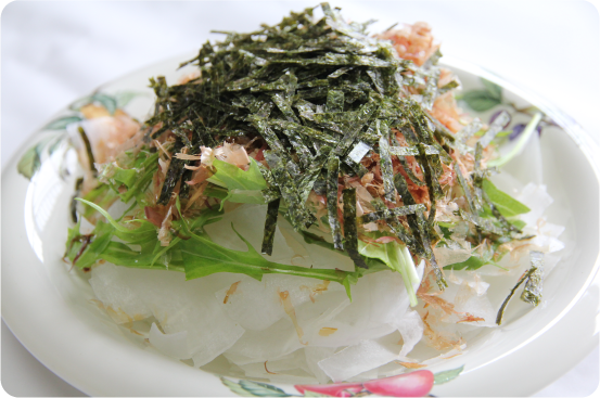 - 水菜を5㎝に切り、だいこんに乗せる。