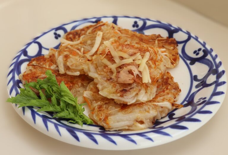 - 汁気を取った➁へ小エビ(ホタテでも可)などお好みの具材を入れて、片栗粉、かつお節、チーズ、塩コショウを加えて混ぜる。