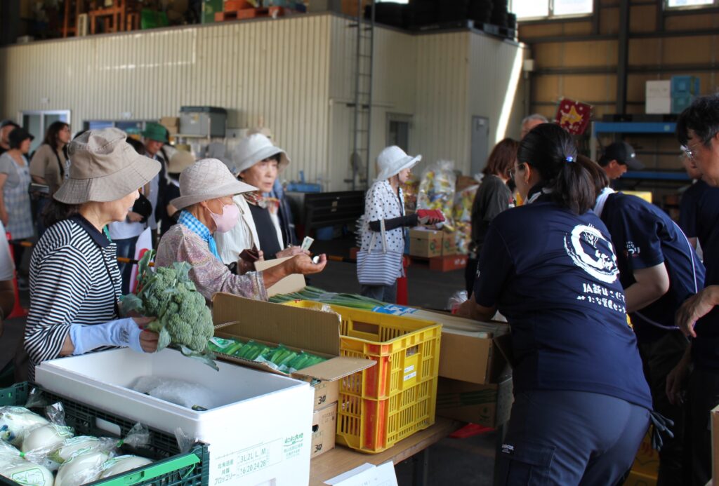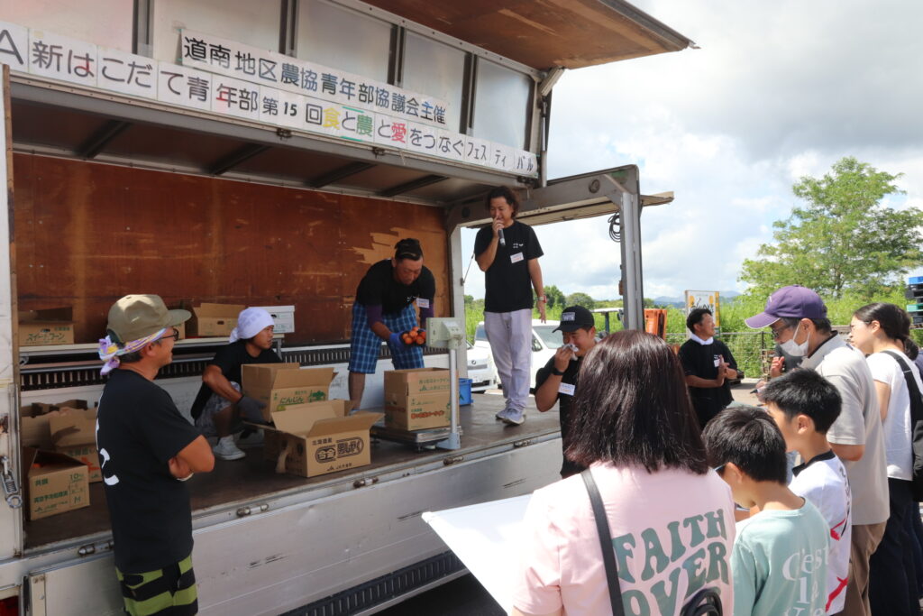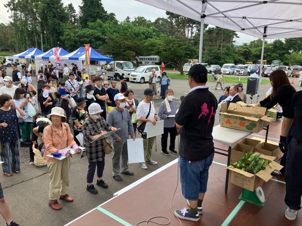 8月23日、森営農センターは、森町地域活性化広場にて野菜重量当てゲーム、牛乳の無料配布、ジャガイモ詰め放題、カボチャやトマト、スイートコーンなどの地場産野菜の販売を行いPRしました。