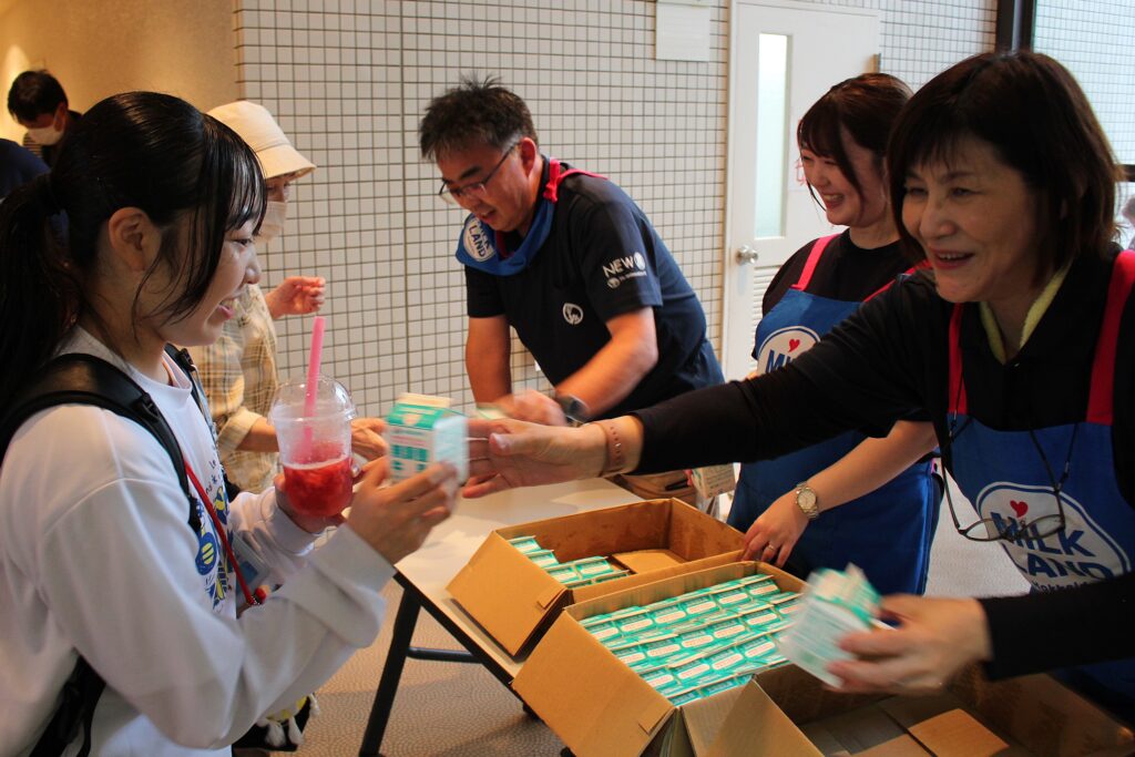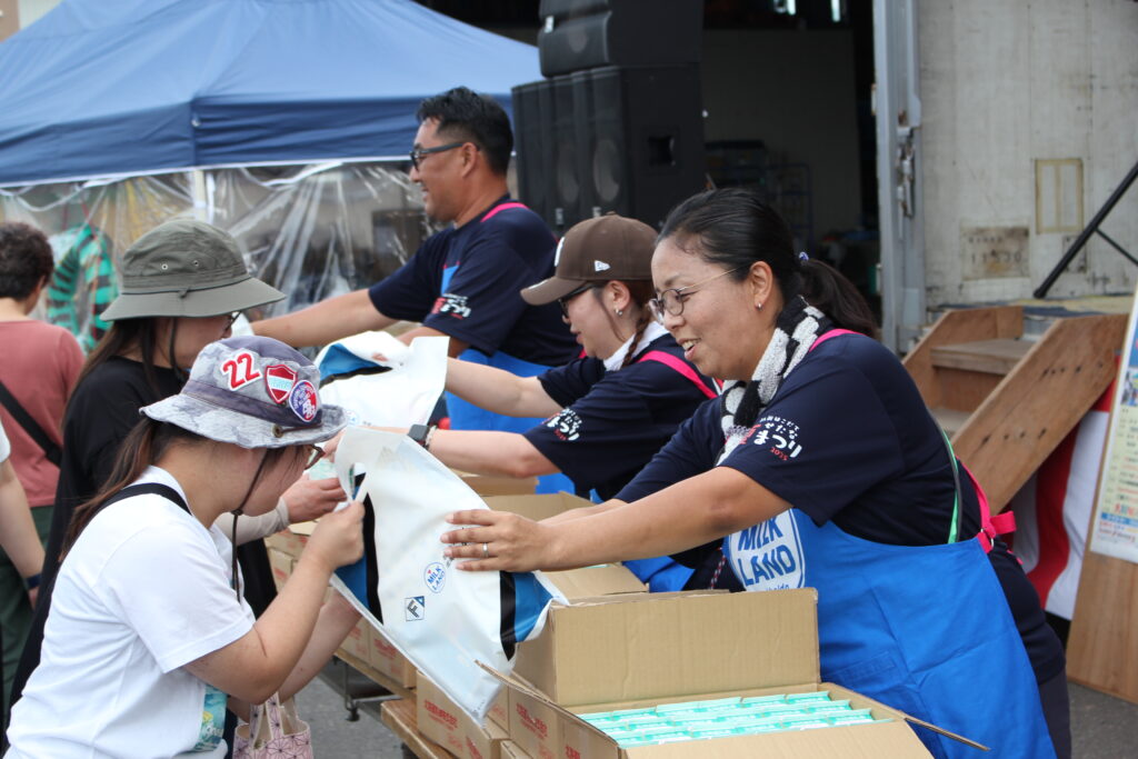 7月18日、せたな営農センターは、町民ふれあいプラザにてひらかわ牧場や、デーリィファーム若松のアイスクリーム、チョコバナナを販売、牛乳の無料配布も実施し、牛乳消費拡大をPRしました。