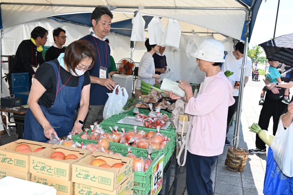 6月28日・29日、北斗営農センターは、新函館北斗駅にて北斗市産の長ネギ、トマト、キュウリなどを販売し、両日とも完売となる盛況で地元野菜の人気をPRしました。