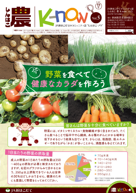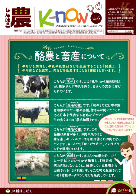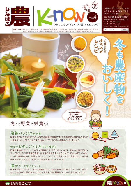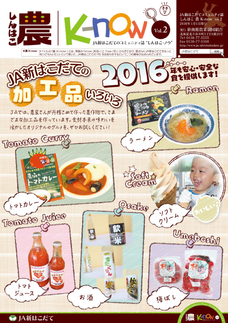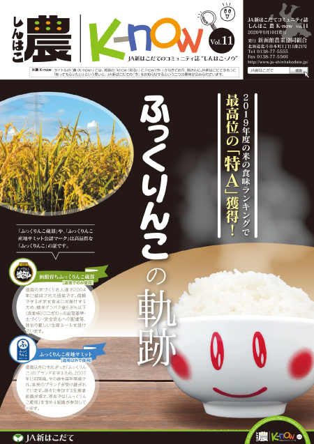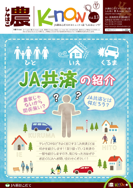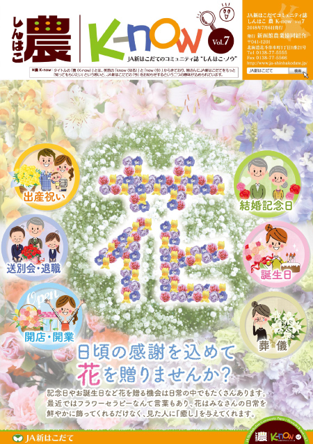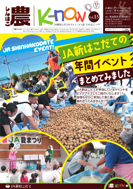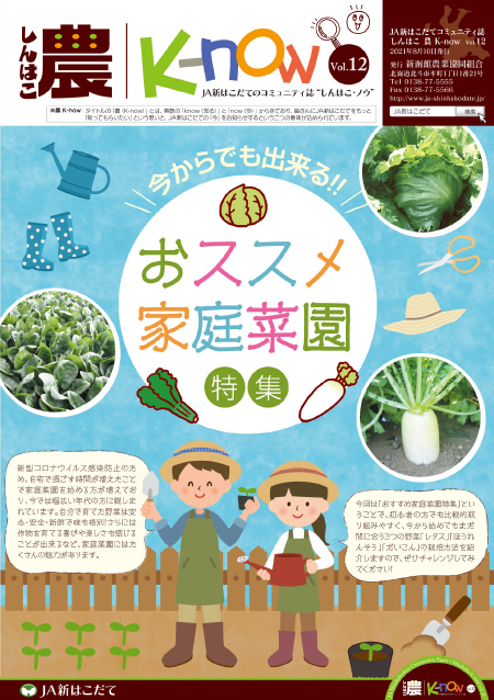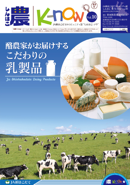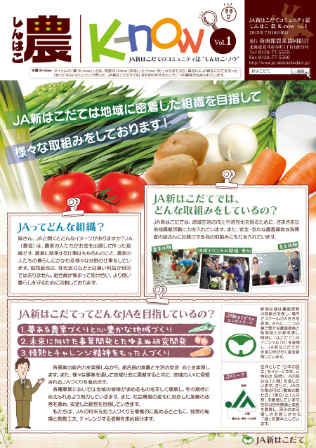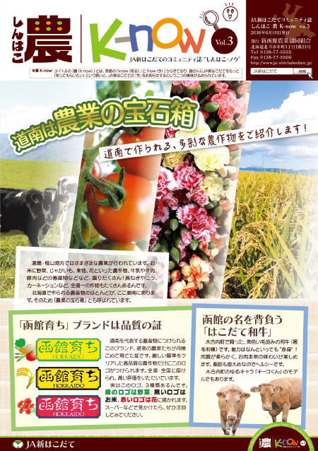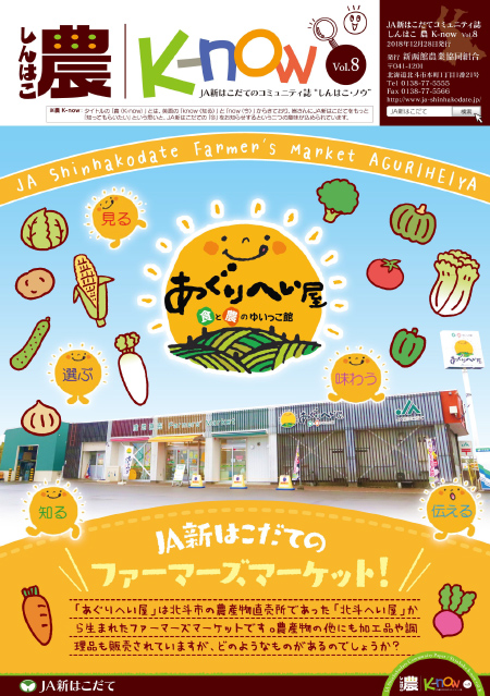 「農K-now」とは、英語の「know(知る)」と「now(今)」からきており、皆さんにJA新はこだてをもっと「知ってもらいたい」という思いと、JA新はこだての「今」をお知らせするという2つの意味が込められています。