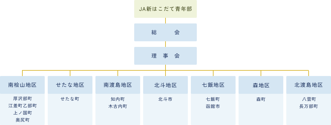 JA新はこだて青年部は、JA新はこだての発足にあわせ、各地区の青年部が合併して生まれました。令和5年度には創立20周年を迎え、現在は以下の7地区201名の盟友が活躍しています。